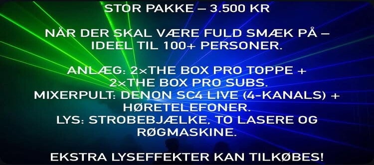 Vores udstyr dækker alt fra små anlæg til store løsninger med laser, røgmaskine og strobelys – og vi hjælper dig gerne med at finde den pakke, der passer bedst til netop din fest.